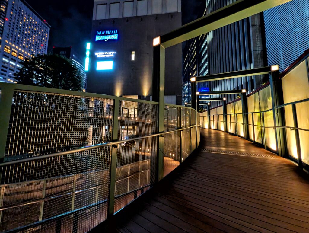 夜間は暗いため、カメラのシャッターが長く開きます。撮影中、体を動かさないのはもちろんですが、壁や手すりなど体がよりかかる場所があれば、よりかかって少しでも動かないようにしたいところです。